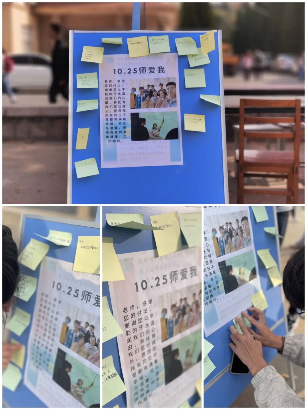 10月25日,公司心理健康协会在小五四广场设置"心语心愿板”,邀请同学们在便利贴上写下对老师的感激与祝福。同学们一字一画地写下了他们对老师的祝愿、对未来的憧憬、对祖国的展望。他们眼里既有坚定不移,也有星辰大海。老师陪他们走过风风雨雨,他们用实际行动回报老师和母校。