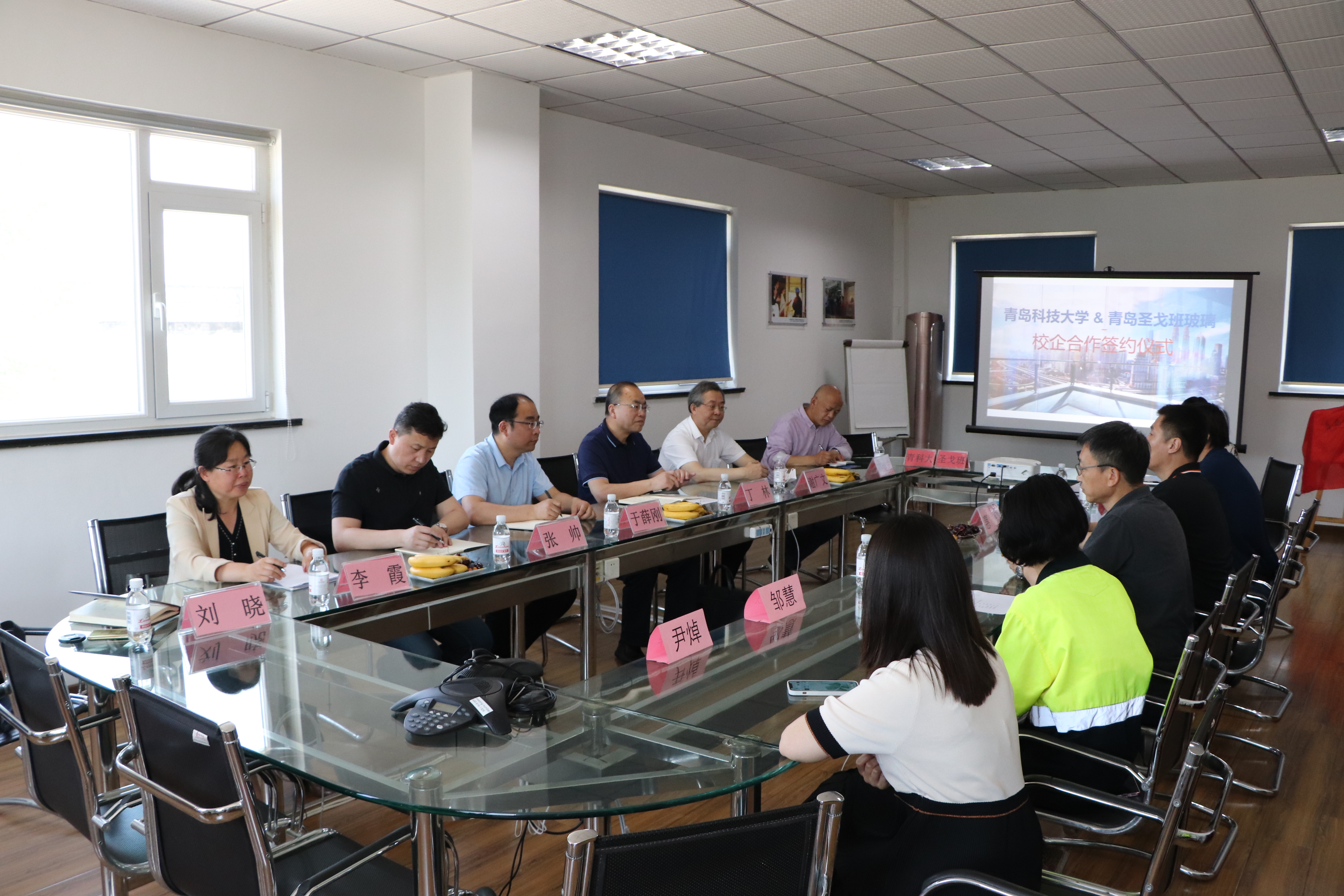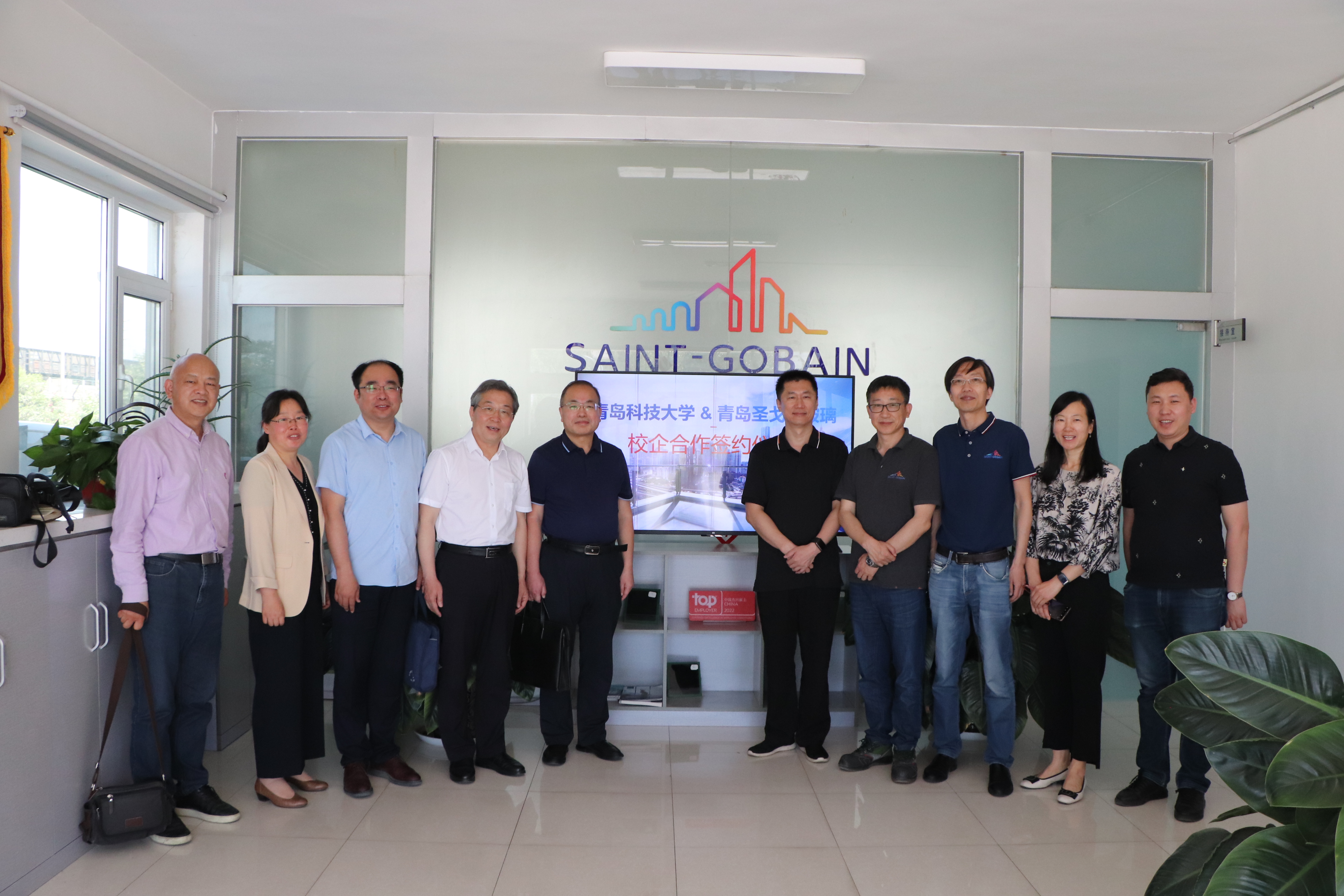 5月31日,公司党委常委、副董事长丁林、公司经理谢广文一行到青岛圣戈班玻璃有限公司走访调研,并举行校企合作签约及教学实习就业基地揭牌仪式。仪式在青岛圣戈班玻璃有限公司会议室举行,公司总经理惠钧、财务总监管鲁峰、工业总监王丕刚、人力资源部经理顾晓娟、公司副书记高继宏、副经理于薛刚及部分教师代表参加了仪式。