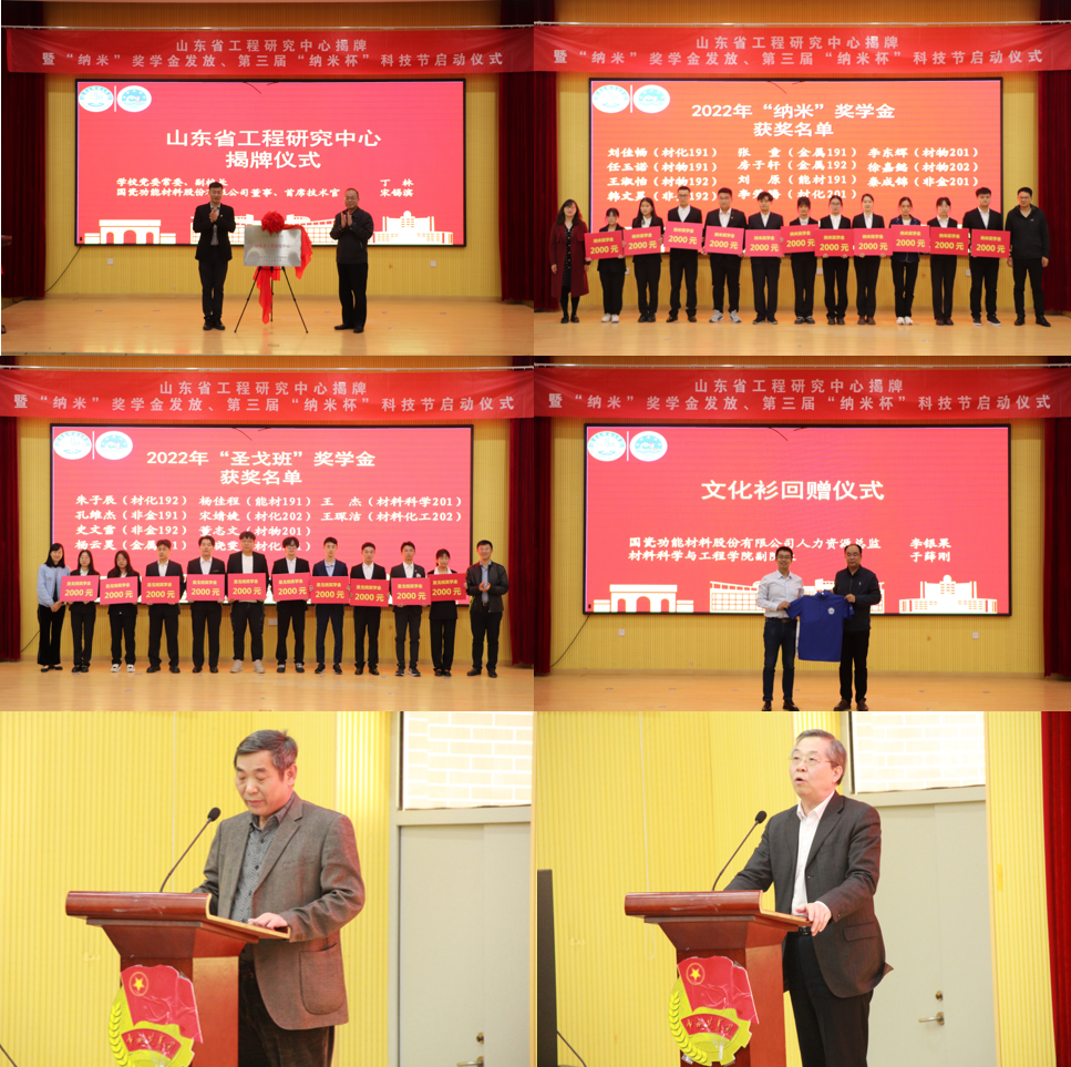 仪式上,丁林与宋锡滨为山东省工程研究中心揭牌。公司经理谢广文介绍了“纳米”奖助学金和“圣戈班”奖助学金的设立与发放情况。王丽与熊克思为2022年“纳米”奖学金获奖员工颁奖。顾晓娟与刘跃宁为“圣戈班”奖学金获奖员工颁奖。公司副经理于薛刚向国瓷公司人力资源总监李银果回赠文化衫。公司党委书记杜芳林介绍了“纳米杯”科技节取得的成果与后续活动情况。最后,与会嘉宾共同上台启动第三届“纳米杯”科技节。