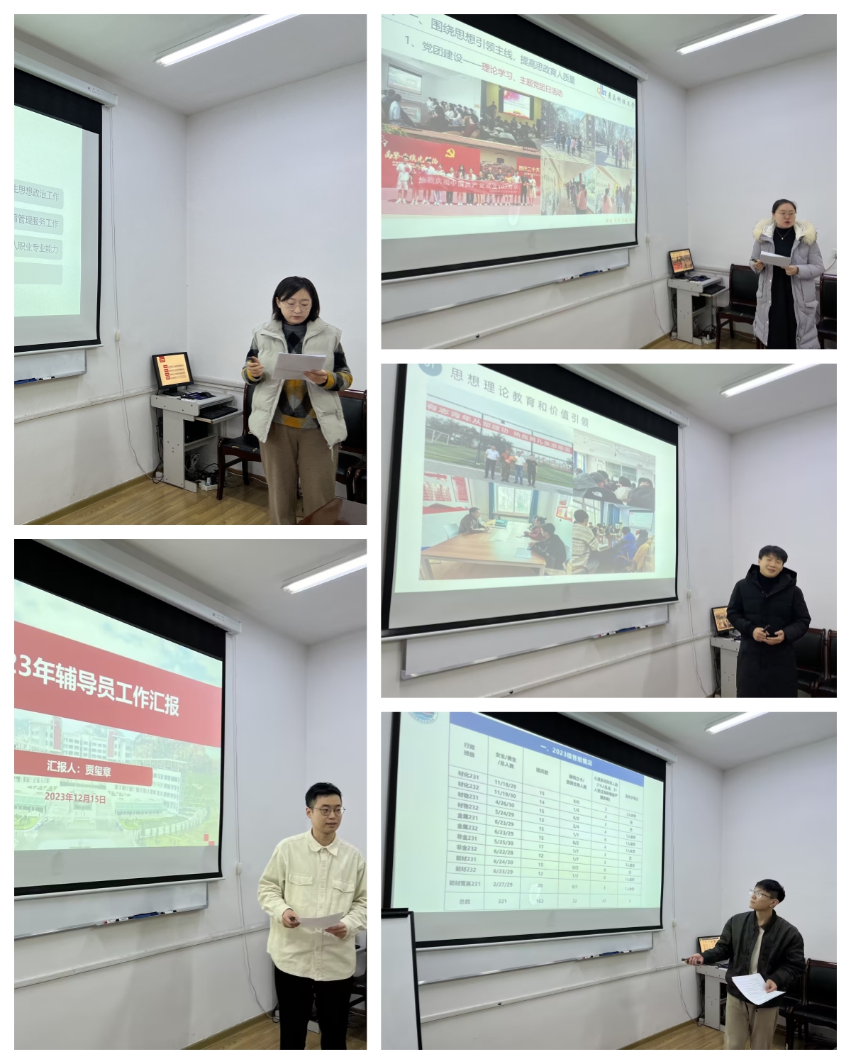 会上,各年级辅导员分别从思想引领主线、日常管理基线、员工发展引线、专业素养高线、个人发展路线等几方面对2023年度员工工作情况进行汇报,对所取得的成就和存在的不足进行个人分析,并做好个人目标规划。