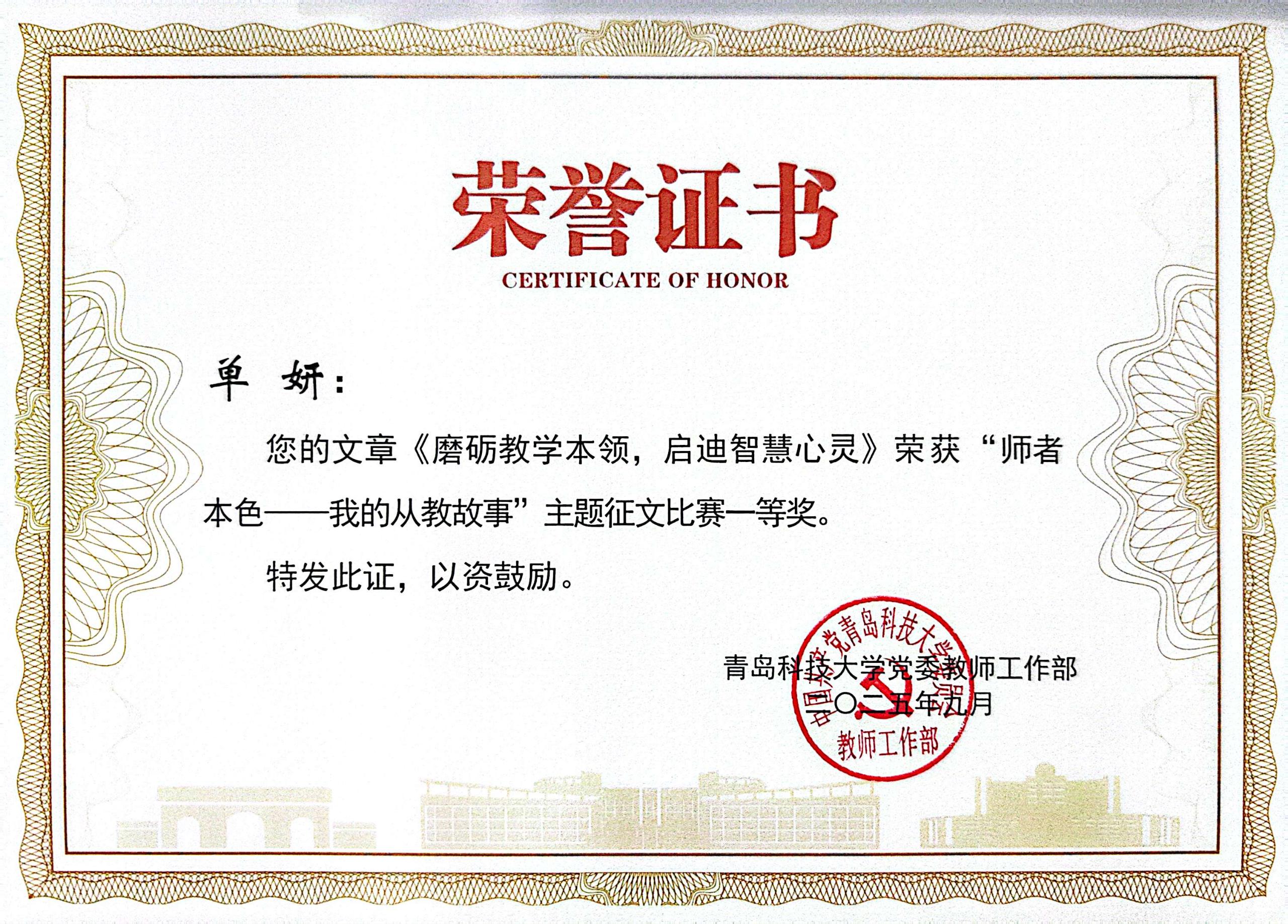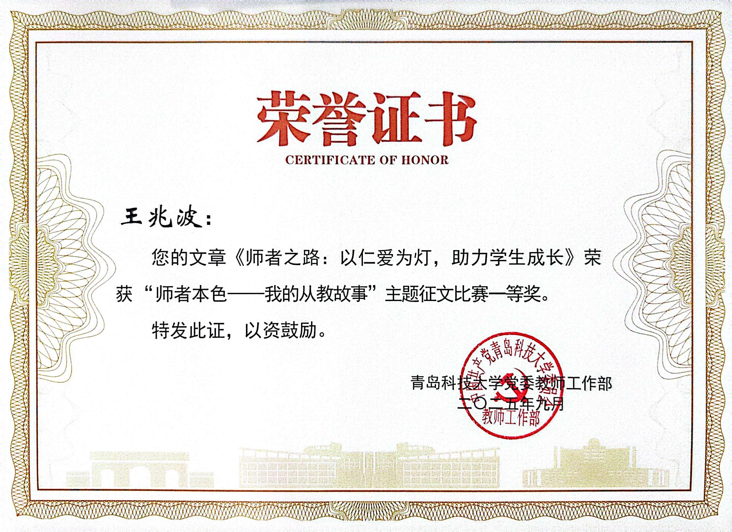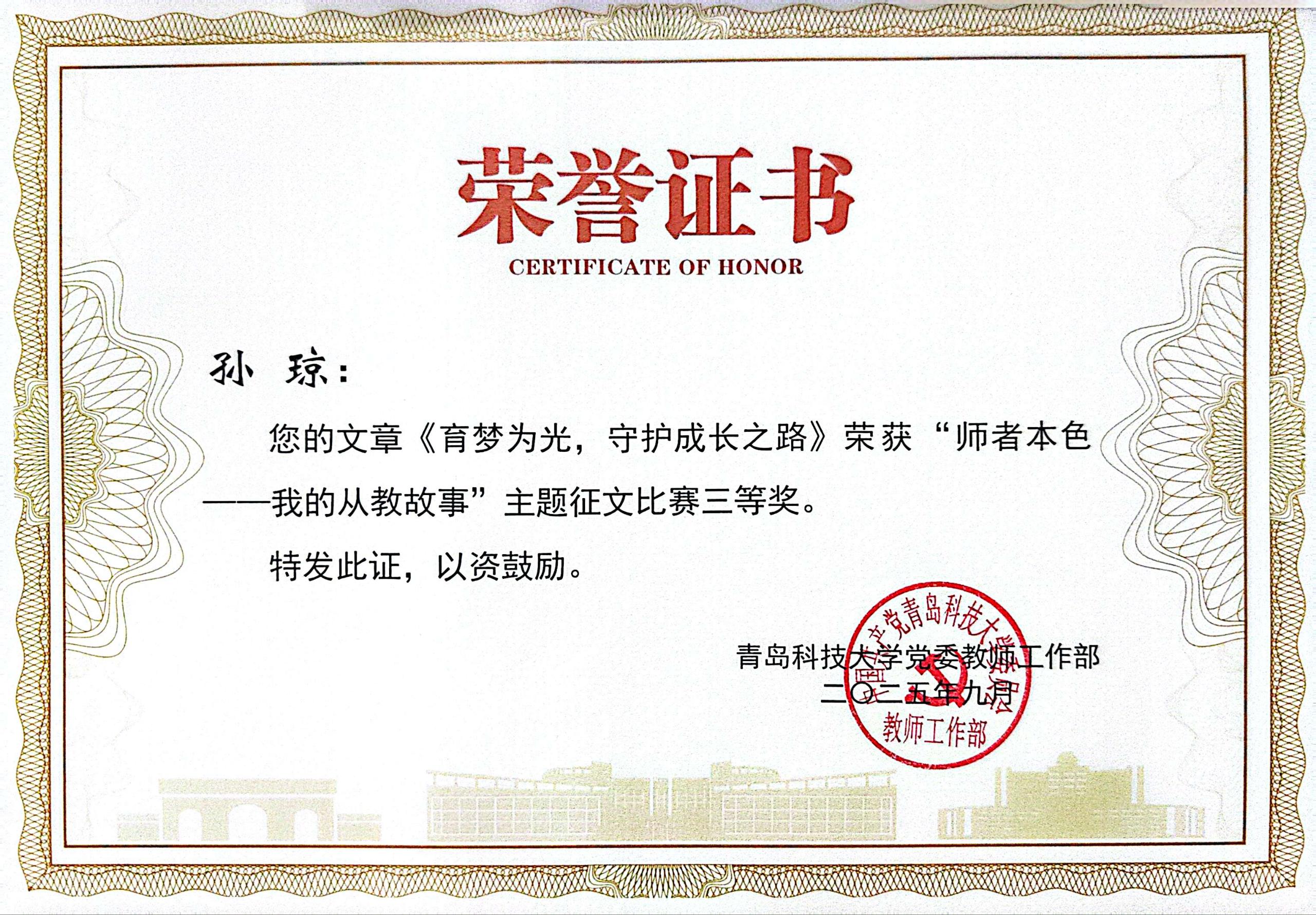 公司王兆波老师的文章《师者之路:以仁爱为灯,助力员工成长》荣获“师者本色—我的从教故事”主题征文比赛一等奖;单妍老师的文章《磨砺教学本领,启迪智慧心灵》荣获“师者本色—我的从教故事”主题征文比赛一等奖;潘超超老师的文章《五色经纬里的青春答卷》荣获“师者本色—我的从教故事”主题征文比赛二等奖;孙琼老师的文章《育梦为光,守护成长之路》荣获“师者本色—我的从教故事”主题征文比赛三等奖。