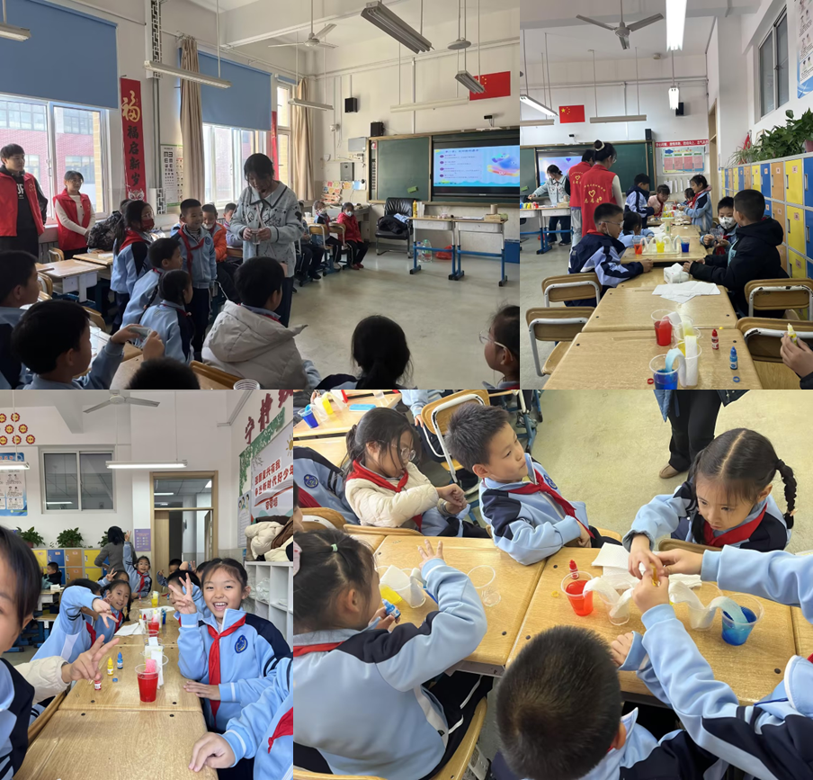 志愿者带着精心准备的实验器材,满怀热情地走进育才小学的课堂。随着实践团队与大家的亲切问候,科普课堂正式拉开帷幕。在欢快的互动中,志愿者讲师自然地引出了本次实验课堂主题—“沉底的回形针”及“纸巾彩虹桥”。在实验演示环节,实践团队首先向同学们展示了“魔法工具箱”,并设置提问引发了同学们的热烈讨论。随后,志愿者讲师按照清晰的步骤向大家进行实验试操作,同时志愿者分工辅助二年级同学们进行小实验操作,课堂气氛十分活跃。在实验课堂开展中,志愿者讲师用通俗易懂的语言和生动的比喻进行讲解,以童趣的表达向二年级同学传授“表面张力”及“毛细现象”的概念,并巧妙地将科学实验与语文学习相结合。同学们积极参与,踊跃发言,巩固了同学们的古诗及句式练习的基础,提升了同学们的观察、动手和语言表达能力。