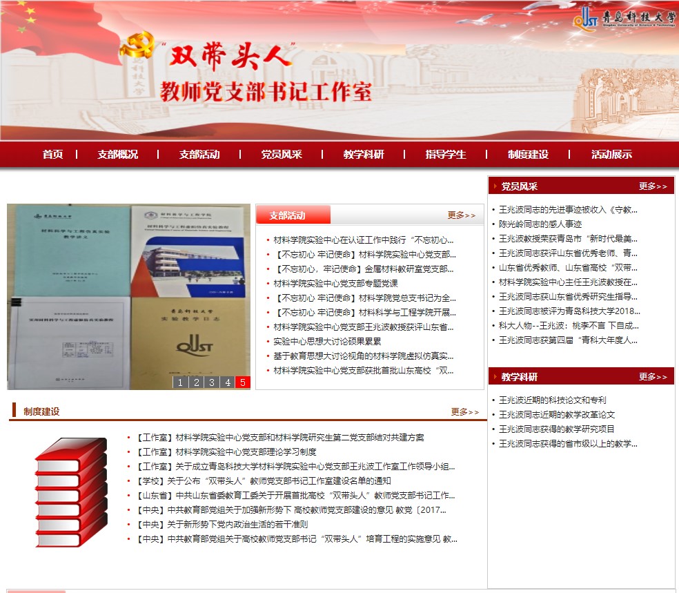 在高校“双带头人”教师党支部书记工作室的建设中,bw西汉姆联实验中心党支部抓好党建主责主业,强化支部政治功能,提升思想政治工作质量,促进公司事业发展,抓好支部班子建设。为了发挥“双带头人”工作室“样板田”、“示范区”作用,促进“双带头人”工作室更好开展理论研究和实践探索,示范引领、辐射带动教师党支部建设和教师思想政治工作质量整体提升,bw西汉姆联实验中心党支部书记工作室建设了“山东省高校“双带头人”教师党支部书记工作室”网站(https://sdtr.qust.edu.cn),为更好地实现“双带头人”工作室的示范作用,发挥了重要的作用。