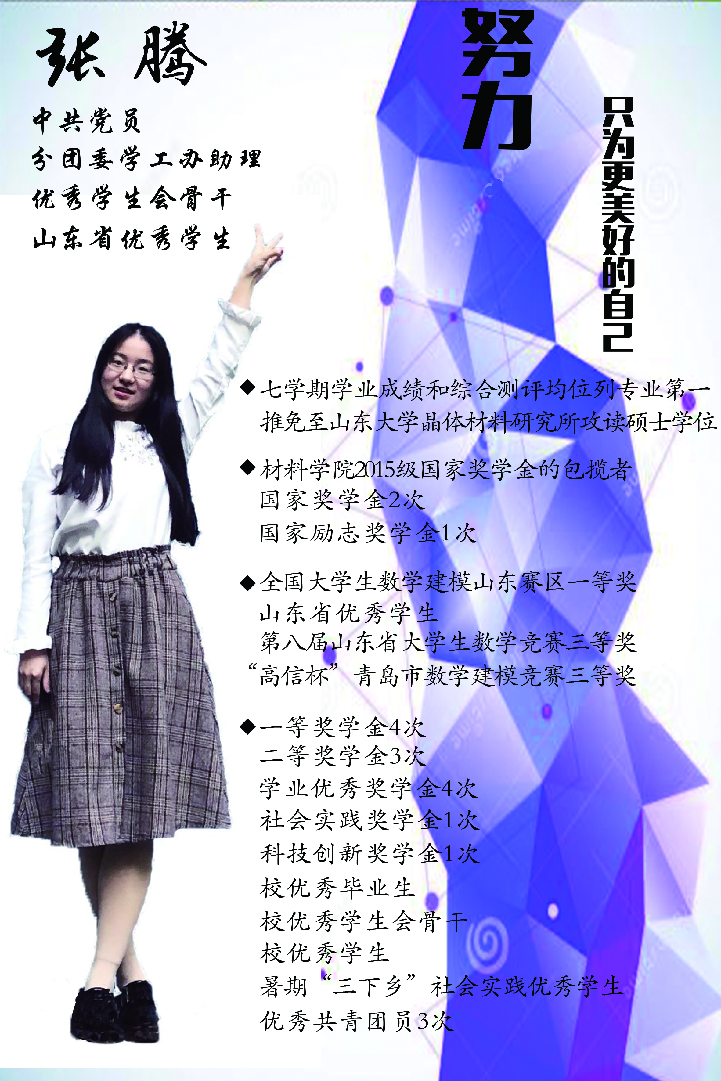 她是2015级国家奖学金包揽者,曾连续两次获得国家奖学金。七个学期以来,历年平均成绩90.5,平均学分绩点3.99,综合测评及学业成绩均位列专业第一,获得各级奖学金及荣誉20余项,现已被推免至山东大学晶体材料研究所攻读硕士学位;注重自主学习,一次性通过英语四六级、教团队格证考试,考取全国计算机二级证书。此外,她积极参加英语、数学等学科竞赛以及数学建模比赛并获奖,参与申报全国老员工创新创业项目,走进实验室开展科研工作。作为员工干部、员工党员,她尽职尽责为师生服务,组织开展几十余项院特色活动,多次带领同学开展团学培训活动,为院两代会的召开做出积极贡献并作为员工代表参加bw西汉姆联第二十一次员工代表大会,起党员的模范带头作用。她投身实践公益、奉献青春,参加国际啤酒节、暑期“三下乡”、海尔行等社会实践及“蓝天保卫战”知识竞赛等公益活动,积极参加校运会、羽毛球比赛等体育活动,彰显了新时代老员工的智慧与勤奋、责任与担当、拼搏与朝气!