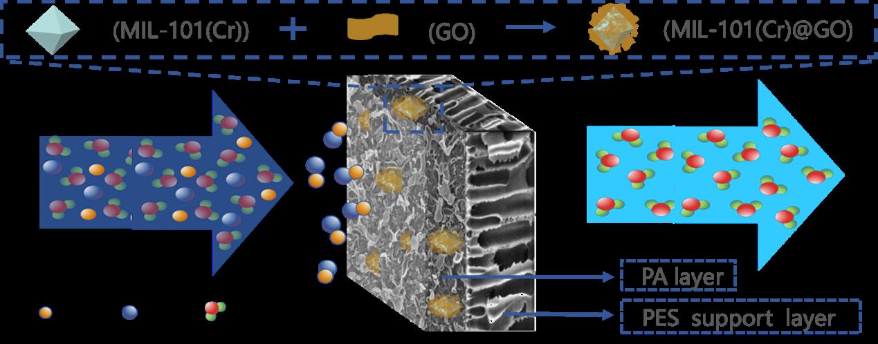 另一篇题为“Doping MIL-101(Cr)@GO in polyamide nanocomposite membranes with improved water flux ” (2020, 492, 114601. https://doi.org/10.1016/j.desal.2020.114601)。在该项研究中通过界面聚合的方法制备了一种MIL-101(Cr)@GO纳米复合聚酰胺反渗透膜,为反渗透膜性能改善提供了一种新思路。该复合材料结合利用了氧化石墨烯片层间的水分子输运通道和金属有机框架MIL-101(Cr)的孔笼结构所形成的水通道,进而形成了三维多级纳米通道;并采用界面聚合的方法制备了具有多级水分子传输孔道的MIL-101(Cr)@GO纳米复合聚酰胺反渗透膜,为水分子的输送提供了新的可控自由度。该工作揭示了添加多孔材料可以有效为水分子输运提供更多的通道从而改善膜性能的传输机理,当选择多孔材料来修饰复合膜时,将高性能二维材料包裹在其外层上能够对膜性能够产生协同作用。bw西汉姆联宋娜博士为该论文第一作者。
