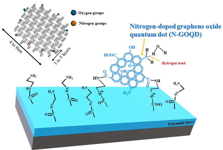 其中一篇题为“Chemical grafting N-GOQD of polyamide reverse osmosis membrane with improved chlorine resistance, water flux and NaCl rejection”(2020, 479, 114341.https://doi.org/10.1016/j.desal.2020.114341)。在这项研究中,使用了氮掺杂氧化石墨烯量子点(N-GOQD),其优异的耐氯性能大幅提升聚酰胺反渗透膜表面的耐氯性,且其耐氯性可通过改变接枝条件进行优化。与氧化石墨烯量子点相比,N-GOQD具有更多的-NH2和极性基团,能够明显改善反渗透膜表面的电荷性,增加膜的水通量及NaCl截留率。bw西汉姆联邵斐斐老师和硕士生仪展为该论文的共同第一作者。