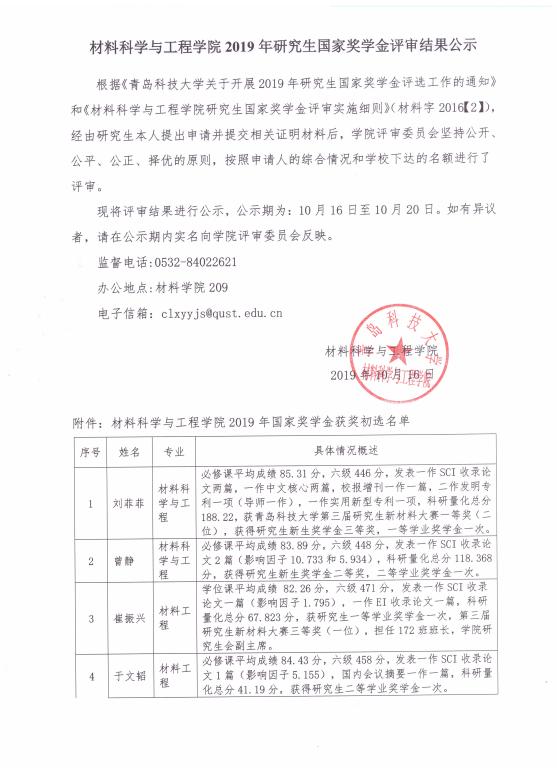 2019年研究生国家奖学金评选公示