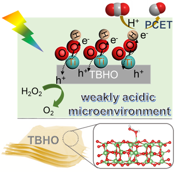 本研究设计合成了尺寸厚度为~3 nm的超薄青铜相TiO2(TiO2-B,TB)片层组成的层级结构样品作为模型光催化剂。利用H2O2分子在TB表面结合形成TB-H2O2(TBHO)活性相,增强了CO2分子吸附并促进了传质。此外,H2O2为催化剂表面提供了弱酸性微环境,有效调节了质子耦合电子转移路径,从而稳定了*COOH中间体。结果显示,通过H2O2的协助,超薄TB纳米片在水相光催化还原CO2过程中表现出优异的CO生成速率(29.1 μmol g−1h−1,是纯TB样品催化性能的11.2倍),并具有近100%的高选择性。