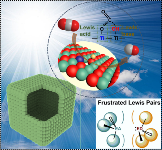 此外,该团队为探索光催化剂面临的其表面对CO2分子弱的吸附和活化能力,严重阻碍光催化CO2还原效率的问题,设计了含有受阻路易斯对(FLPs)的分层级中空TiO2-x空心盒子高效光催化剂,实现了无牺牲剂、无助催化剂条件下的水相高效光催化CO2还原。该工作通过利用原位拓扑转换方法将钙钛矿微米立方块成功构筑成含有受阻路易斯对(FLPs)的分层级中空TiO2-x空心盒子,TiO2-x表面的FLPs是由OVs(Lewis酸位点)及其近端表面羟基(Lewis碱位点)构成。含有FLPs活性位点的催化剂表现出出色的CO2吸附和活化能力,继而呈现优秀的光催化还原CO2为CO的活性。这一发现为在单组分固体光催化剂表面通过原位拓扑变换构建FLPs开辟了一条新途径,也为构筑高效的太阳能转化为化学能的光催化剂提供了新方法。该科研成果以“Construction of frustrated Lewis pairs on TiO2-xderived from perovskite for enhanced photocatalytic CO2reduction”为题,发表在化工领域TOP期刊Chemical Engineering Journal上(Chemical Engineering Journal, 2022, 427, 131554.https://doi.org/10.1016/j.cej.2021.131554)。该成果bw西汉姆联为唯一通讯单位。