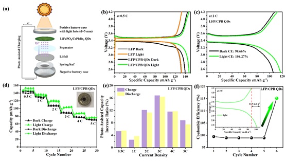 (a)开孔电池装置;LFP和LFP/CPB QDs在黑暗和光照条件下,(b)0.5 C倍率和(c)2C倍率的恒电流充放电曲线;(d)LFP/CPB QDs在0.5 C至5 C倍率下,黑暗和光照条件下的速率性能;(e)LFP/CPB QDs在充放电过程中的光辅助容量增加;(f)LFP/CPB QDs在黑暗和光照下的库伦效率