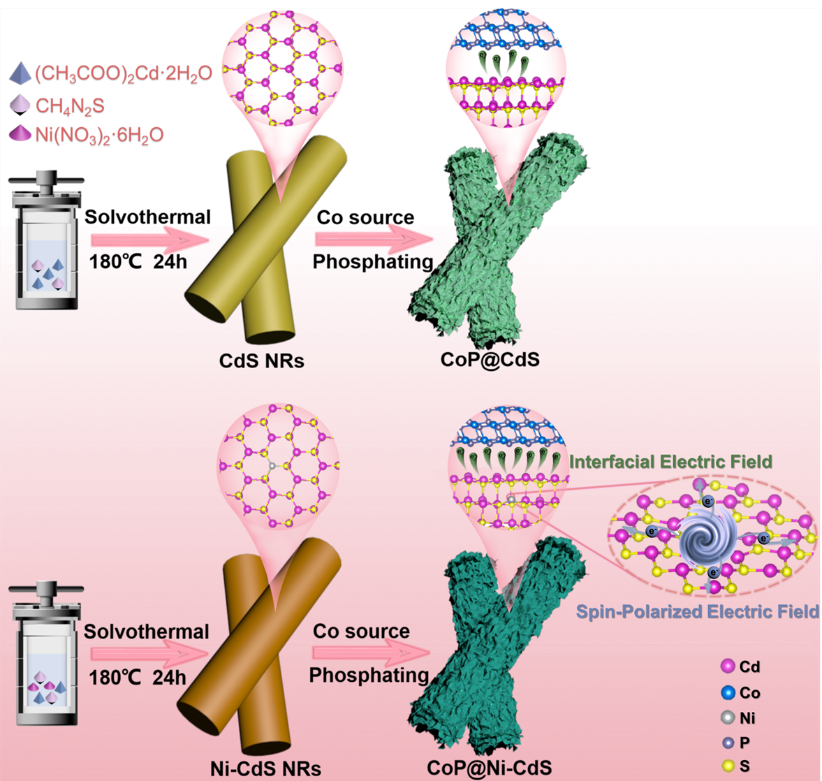 基于半导体光催化分解水制氢技术将取之不尽用之不竭的太阳能直接转化为环境友好的氢能,有望克服日益增长的能源需求和环境污染危机问题。CdS光催化剂具有合适的带隙、能带结构,并满足将质子还原为氢气的热力学要求。然而,纯CdS的光催化活性往往受到光生电子-空穴对的严重复合以及对H2O分子和H*中间体的不合适的吸脱附性限制。为解决以上问题,本研究在CdS纳米棒中掺杂磁性Ni元素并负载CoP纳米颗粒构建了具有串联双电场的肖特基异质结光催化剂。系列实验和理论计算证实原子分散的Ni原子以Ni-S-Cd配位形式掺杂到CdS的晶格中,引起了CdS晶格畸变,增大其分子偶极矩,进而诱导自旋极化电场的形成;并且磁性Ni原子的掺杂增大了CdS与CoP的费米能级差,有助于增强内建界面电场强度。自旋极化电场与增强的内建界面电场协同加速光生电荷分离与迁移动力学,并优化活性位点的电子构型,加速析氢反应动力学,从而实现高效的光催化析氢。