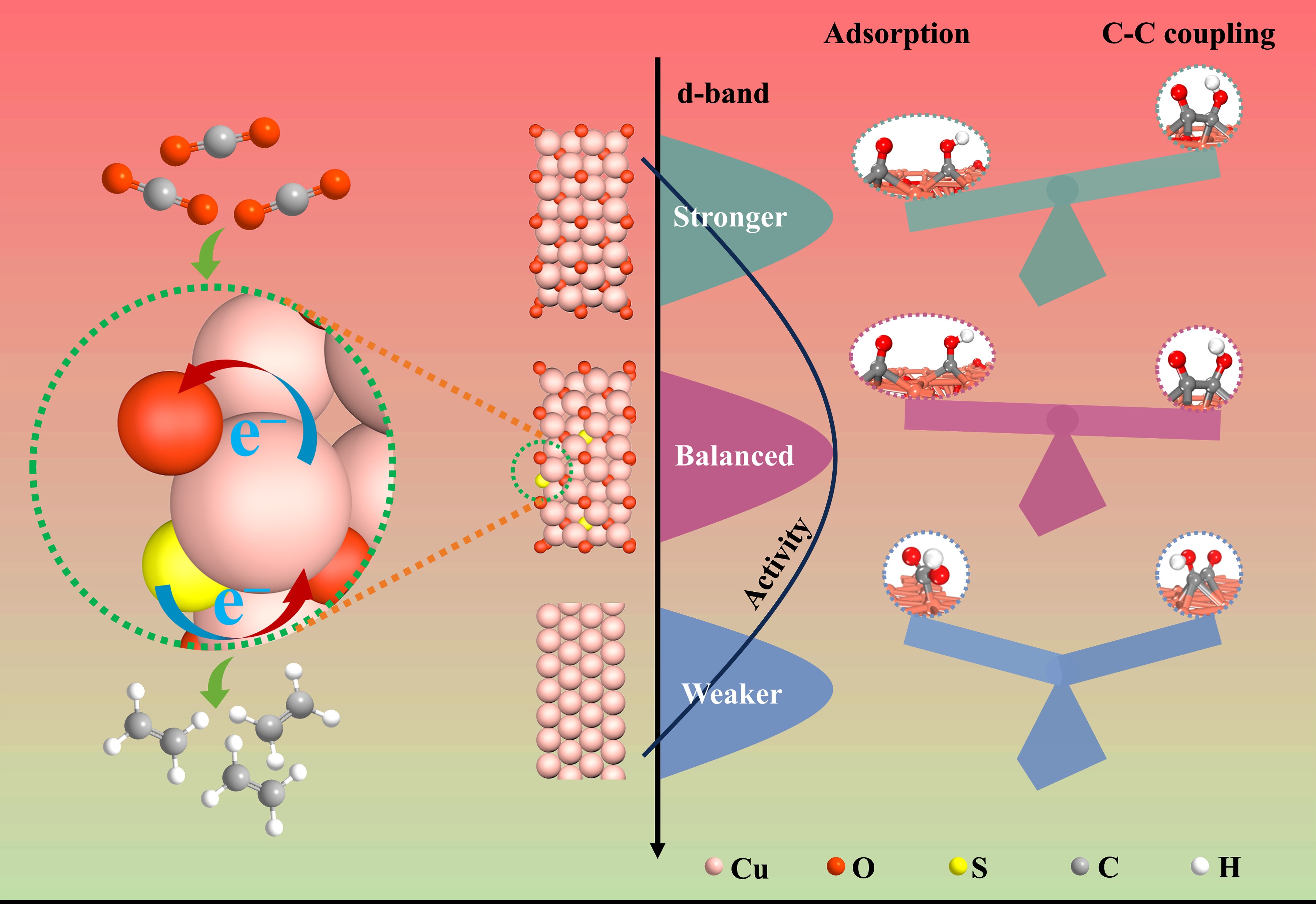以可再生能源电力驱动CO2催化转化为高附加值、高能量密度的C2+产物是实现温室气体CO2高值化利用的有效手段。Cuδ+是CO2电还原为C2+产物的活性位点,然而其在较负的工作电位下会被还原为Cu单质而丧失催化活性。非贵金属元素掺杂是稳定Cud+的有效手段,在众多含有非金属元素(N、P、S、卤素)的Cu基催化剂中,S因具有较大电负性且有望稳定Cuδ+。但已有的研究中,S主要存在于表面并且表面S的逸出会破坏催化剂结构稳定性,从而导致其较差的CO2电还原(CO2RR)性能。此外,由于表面S对*OCHO(HCOOH的中间体)中间物种的吸附能力较强,而对*COOH(CO的中间体)中间物种的吸附能力较弱,大多数含S的铜基催化剂在CO2RR中的主要产物是HCOOH。不仅如此,非金属掺杂的铜基催化剂在CO2RR过程中会发生结构重构,揭示催化剂活性位点-性能关系面临着严重的挑战。