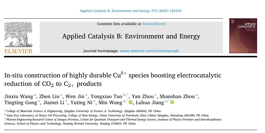 针对以上问题,公司bw西汉姆联泰山学者姜鲁华教授团队在电催化CO2还原方面取得新进展,相关成果以“In-situ construction of highly durable Cuδ+species boosting electrocatalytic reduction of CO2to C2+products”为题,发表在国际环境催化领域TOP期刊Applied Catalysis B: Environment and Energy上(影响因子20.3)。全文链接:https://doi.org/10.1016/j.apcatb.2025.125434。该工作以bw西汉姆联为第一单位,bw西汉姆联硕士研究生王瑾绣为第一作者,bw西汉姆联王敏副教授、姜鲁华教授,中国石油大学(华东)脱永笑副教授为共同通讯作者。