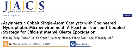 第一项研究成果以“Asymmetric Cobalt Single-Atom Catalysts with Engineered Hydrophobic Microenvironment: A Reaction-Transport Coupled Strategy for Efficient Methyl Oleate Epoxidation”为题发表于JACS。该研究针对可再生植物油(如大豆油、菜籽油等)催化转化为高附加值化学品过程中,催化剂活性低、选择性差及传质受限等瓶颈问题,提出了一种“反应-传递耦合”的新策略。团队创新性地设计并合成了一种具有非对称Co-N2-O2配位结构的单原子催化剂。理论计算与实验研究表明,与传统的对称Co-N4位点相比,这种非对称结构有效调控了中心Co原子的电子态,使其d带中心显著上移,从而极大地增强了催化剂对O2分子的本征活化能力。在此基础上,研究团队通过烷基酸酐对催化剂表面进行功能化修饰,构建了疏水性反应微环境。该疏水界面不仅能有效富集亲油性的植物油底物分子,还能形成“富氧表面”,显著提高活性位点局部的O2浓度,从而克服了黏性反应体系中长期存在的传质瓶颈。得益于“反应-传递耦合”的协同增效机制,该催化剂在温和条件下(常压O2)催化油酸甲酯环氧化反应的转换频率(TOF)高达1356 h⁻1,选择性大于99%,远超目前已报道的大多数多相催化体系,为生物质资源的高效、绿色转化提供了新思路。全文链接:https://doi.org/10.1021/jacs.5c09407