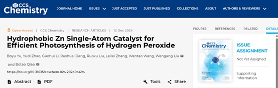 另一项重要成果以“Hydrophobic Zn Single-Atom Catalyst for Efficient Photosynthesis of Hydrogen Peroxide”为题发表于CCS Chemistry。该工作聚焦于绿色氧化剂过氧化氢(H2O2)的人工光合成领域,针对传统半导体光催化剂存在产物H2O2易在催化剂表面发生二次分解导致选择性差的难题,提出了一种基于传质强化的“捕获-释放”(capture-release)催化策略。