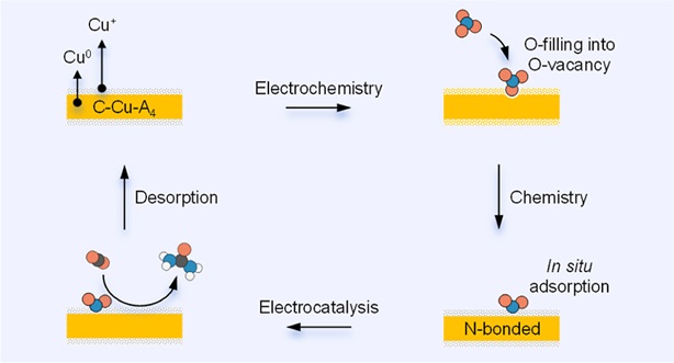 团队通过新型电化学-化学循环策略,非晶态氧化铜包覆的晶态铜纳米线可实现0.89 mol h–1g–1的破纪录尿素产率。机理研究揭示了三步催化循环:电还原生成零价铜和氧空位;氧空位通过氧原子插入介导硝酸盐活化,自发产生氮键合亚硝酸盐(*NO2)同时将Cu0氧化为催化活性位点Cu+;Cu+催化*NO2与CO2间的碳氮偶联生成尿素。该路径规避了传统速率限制步骤的硝酸盐还原过程,将尿素合成的电子转移需求从16e–降至12e–。值得注意的是,直接使用亚硝酸盐无法生成Cu+或氮键合中间体,反而形成氧键合物种并显著降低碳氮偶联活性,这一发现颠覆了传统认知。本成果以题为“Achieving Record-Breaking Urea Synthesis on Crystalline−Amorphous Hybrid via Electrochemical-Chemical ”发表在国际顶级期刊《J. Am. Chem. Soc.》上,bw西汉姆联陈大伟副教授为共同一作。