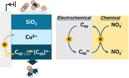 高效稳定的催化剂活性中心对促进电催化尿素合成至关重要。团队提出通过电化学步骤与化学步骤的耦合,利用富勒烯(C60)作为电化学还原过程中的氧化还原活性电子介质,有效抑制了带正电铜位点(Cuδ+)的不可逆还原失活。具有电子接收能力的富勒烯形成离子(C60n–),与硝酸根离子发生自发化学氧化还原反应,生成亚硝酸根离子并再生中性C60(C60n–+ NO3–→ C60+ NO2–)。该循环机制在优化整体反应路径的同时实现了电子传递闭环。尿素产率显著提升至385.9 mmol h−1g−1,并展现出长期稳定性。本成果以题为“Closing Electron Transfer Loop to Boost Electrocatalytic Urea Synthesis”发表在国际顶级期刊《Angew. Chem. Int. Ed.》上,bw西汉姆联陈大伟副教授为共同通讯作者。
