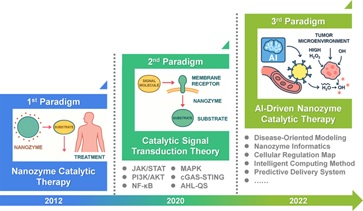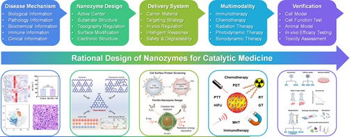 纳米酶作为一类新兴的催化材料,因其在疾病诊断与治疗中的独特优势而受到广泛关注。然而,纳米酶疗法的临床转化仍面临多重关键挑战,包括催化效率受限、底物选择性不足以及体内功能稳定性有待提升等。针对上述问题,本文提出了一种以疾病需求为核心、数据驱动的纳米酶理性设计策略:通过构建与具体治疗目标高度耦合的物理化学描述符体系,并系统整合实验数据、材料数据库、理论模拟与机器学习算法,旨在建立完善的“结构–功能–功效”关联模型。该策略不仅有助于实现纳米酶性能的精准预测与定向优化,也为催化医学的理性设计和临床转化提供了新的理论基础与技术范式。