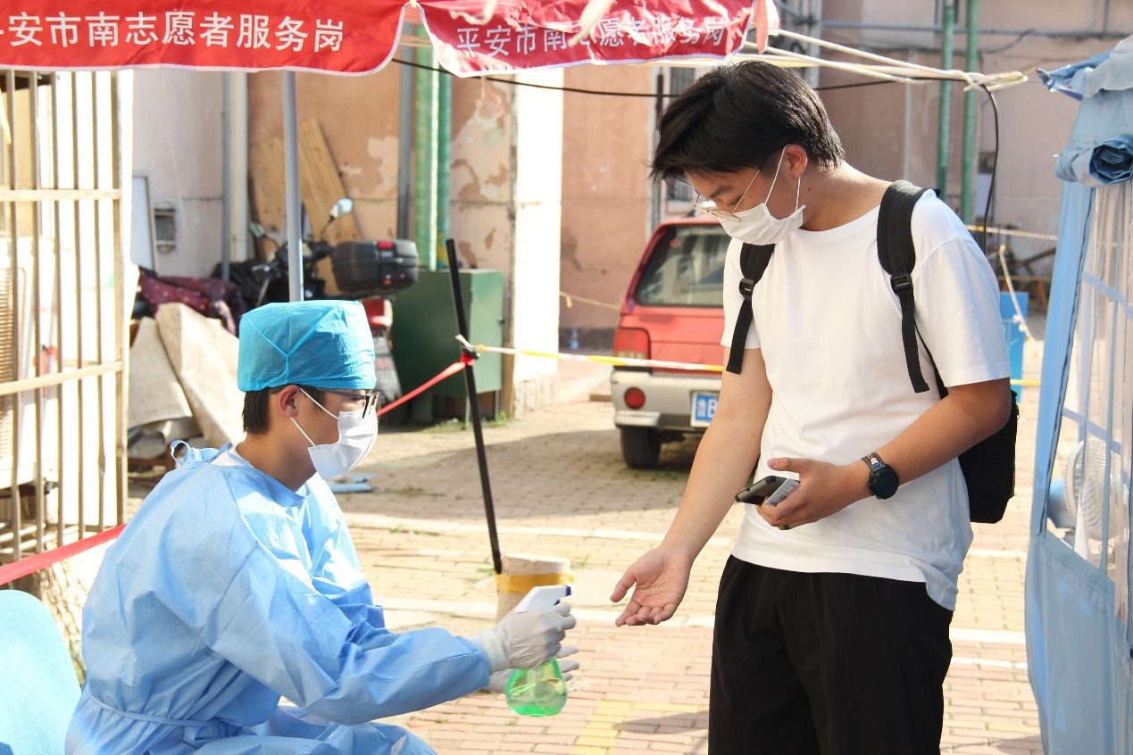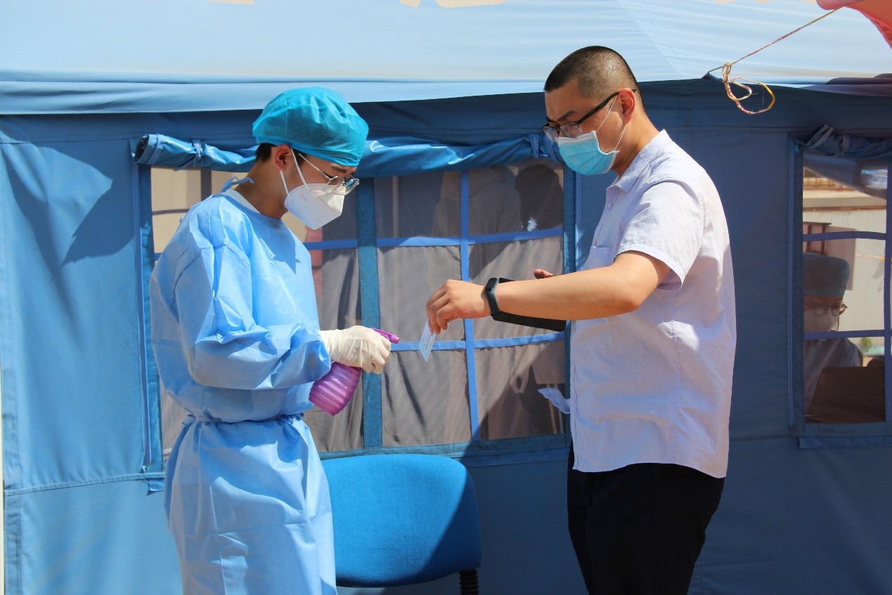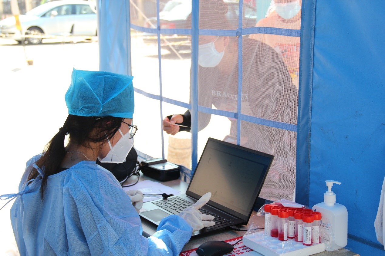 台东街道步行街社区检测点设立了测温区、等待区、身份录入区、采样区等,实行出入分离,分组检测。现场,医护人员规范穿着防护服,全程佩戴口罩和面罩;社区实践的志愿者们在各个等待区待命,维持现场秩序;前来采样的居民按照社区通知提示要求做好个人防护,在志愿者们的引导下保持“两米线”距离,依次进行体温检测、信息登记、身份证消毒、咽拭子采样,采样后迅速从出口离开;医护人员做好样本保存、转运和医疗废物处置,整个过程有条不紊、井然有序。