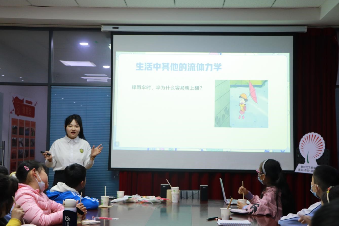 主讲人倪雨菲用通俗易懂的语言向小朋友们讲解生活中的流体力学,通过举例帮助小朋友们理解流体力学,再用贴纸奖励回答问题的小朋友,激发小朋友们的学习兴趣,活动现场和谐融洽,充满欢乐。