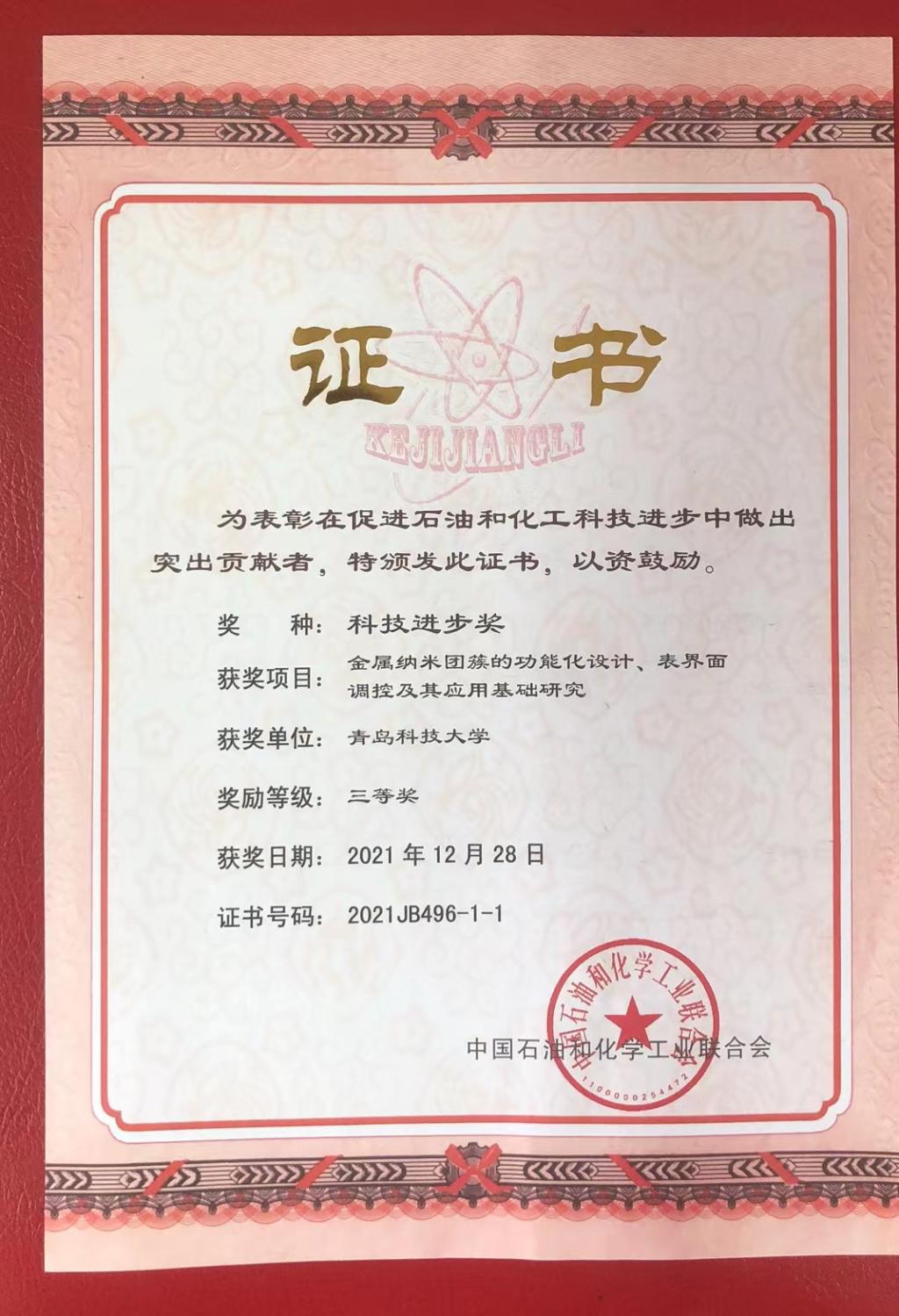 公司金属纳米团簇团队研究成果《金属纳米团簇的功能化设计、表界面调控及其应用基础研究》获得2021年度中国石油与化学工业联合会科技进步三等奖。