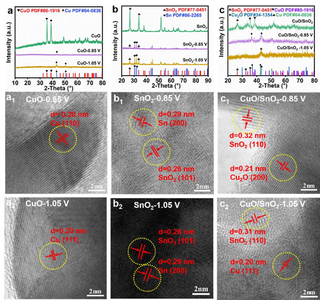 要点1:明确CuO/SnO2的电化学原位重构历程(图1)。利用一系列原位及非原位谱学和显微表征手段明晰了CuO/SnO2在不同电极电势下的结构重构。证据表明,随施加于CuO/SnO2电催化剂上的电位逐渐负移,氧化物异质结构中的氧空位逐渐增多;在-0.85 VRHE电位下,CuO/SnO2重构为Cu2O/SnO2;在-1.05 VRHE电位下,CuO/SnO2重构为Cu/SnO2-x。